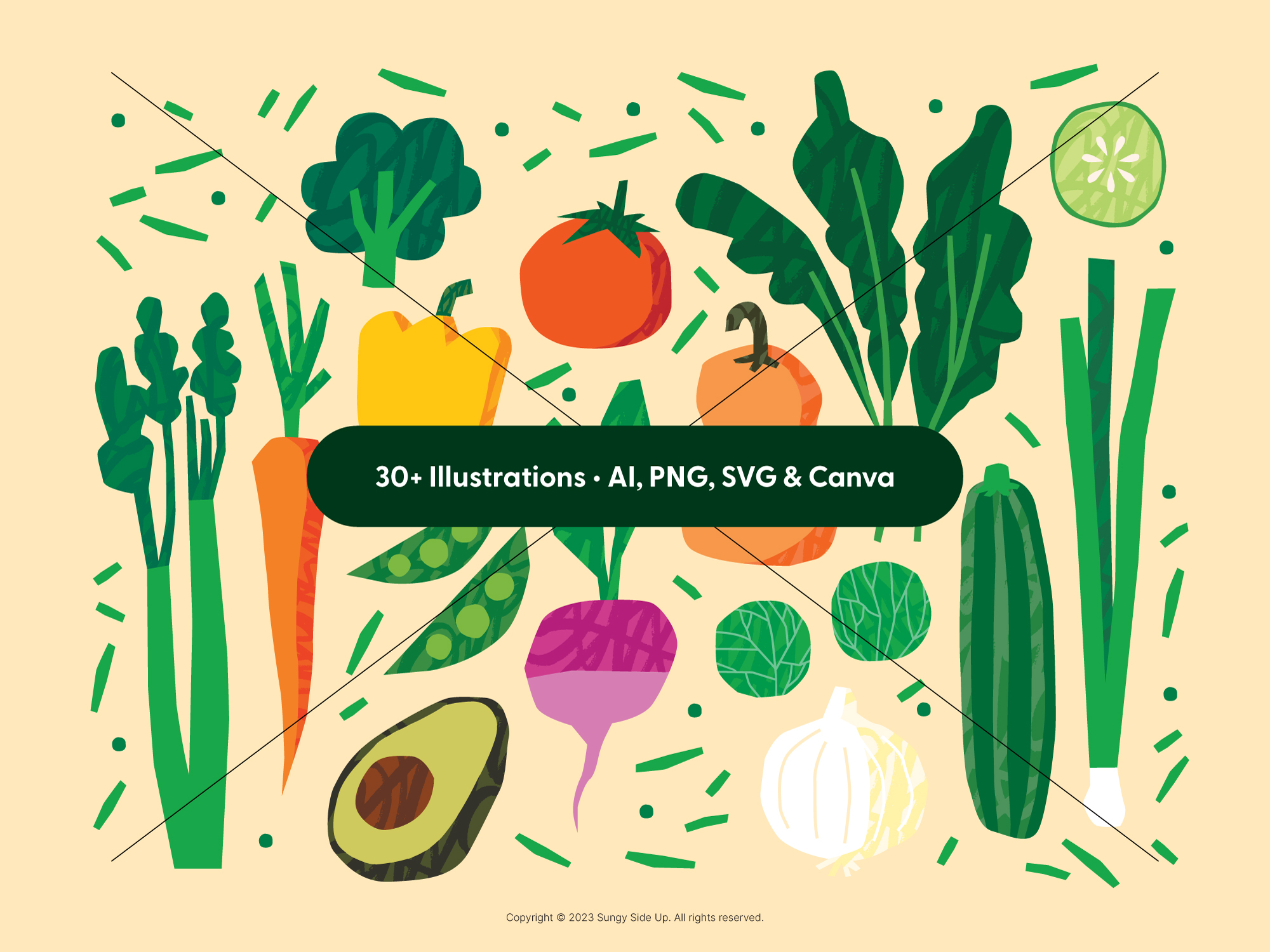 Elevate your creative projects with this Fruits & Vegetables Illustration Pack, designed to give you bright, modern graphics that work across many styles. You’ll get 30+ hand-drawn illustrations in AI, SVG, and PNG formats, and each file is easy to customize in Illustrator or Canva. Because the graphics are clean, scalable, and simple to edit, you can use them for branding, packaging, social media posts, stickers, planners, and digital products without extra effort.